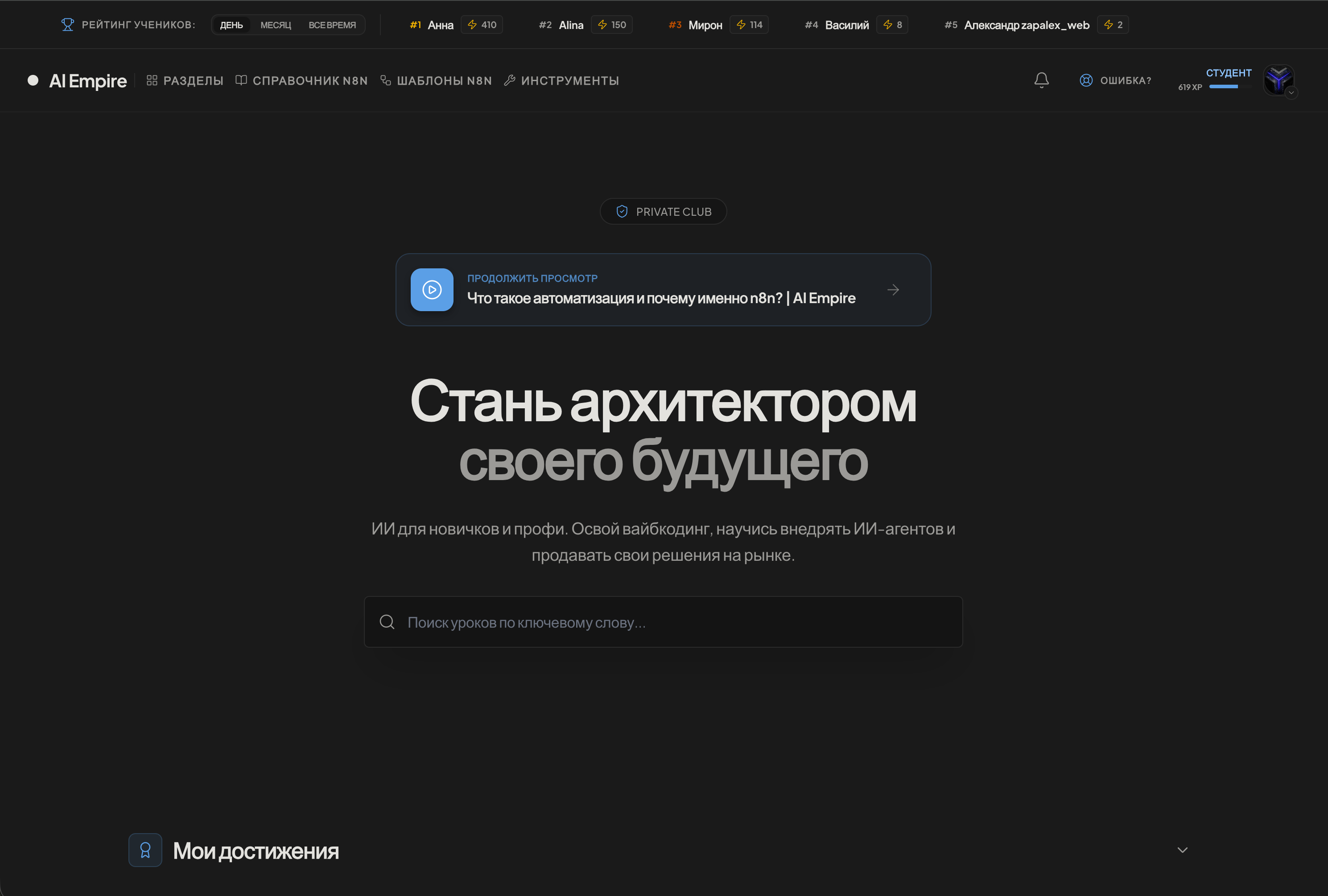 AI Empire: пошаговая структура с нуля. 150+ уроков в чёткой последовательности, живая поддержка кураторов, 1100+ участников рядом — не дадут опустить руки.